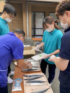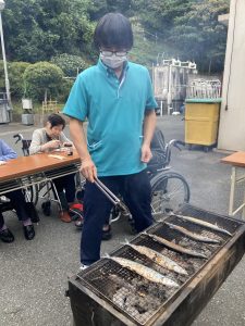 10月7日、秋の恒例行事「初サンマ試食会」が行われました。 柔らかな日差しが降り注ぐ中庭には炭火の香りがただよい、