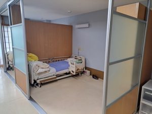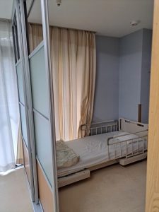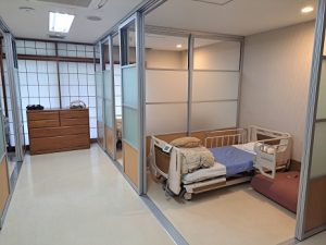 今までのカーテンの仕切りからスライド式のパーティションになり個室のようになり、プライベート空間を確保することが出来ました。 基準より広い居室面積なので、充分に居室スペースも確保出来ています。 パーティションをスライドして解放感ある空間にすることも可能です。